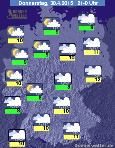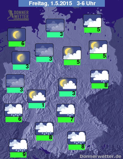 In der Nacht zum 1. Mai fällt besonders im Süden, aber vor allem anfangs auch noch im Osten zeitweise, teils noch ergiebiger Regen. Im Norden, aber häufig auch im Westen des Landes zeigt sich ein sternenklarer Nachthimmel, gebietsweise zieht aber auch lockere Bewölkung durch, dazu bleibt es jedoch trocken. Die Temperatur sinkt auf 9 Grad in Freiburg und bis etwa 1 Grad am Taunus.