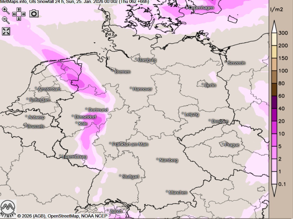 Die Wetter- sowie die Strömungs- / Temperaturkarte für Samstagfrüh (06:00 Uhr) sowie die 24-Stunden-Schneemengen für Samstag nach GFS: