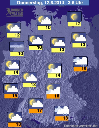 In der Nacht zum Donnerstag können sich im Südosten noch einzelne Schauer und Gewitter entladen, sonst lockert die Bewölkung vor allem im Nordwesten häufig auf und es bleibt überwiegend trocken. Die Temperatur sinkt auf 19 bis 10 Grad.
