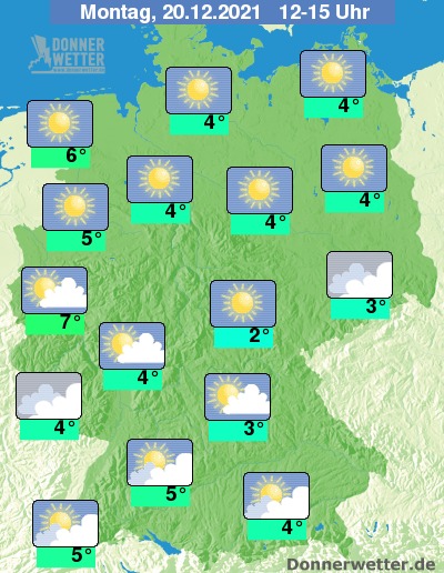 Heute Nachmittag ist es über Sachsen und südlich des Mains noch oft stark bewölkt, die Sonne kann sich teils nur schwer durchsetzen. Im übrigen Land scheint jedoch verbreitet die Sonne von einem meist wolkenlosen Himmel. Es bleibt überall trocken bei 2 Grad im Vogtland und 7 Grad im Rheinland.