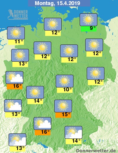 Heute scheint verbreitet die Sonne und es ziehen nur hier und da lockere Wolken durch. Südlich des Mains bleibt es allerdings gebietsweise auch stark bewölkt, dazu jedoch ebenfalls trocken. Die Temperatur steigt auf 9 Grad in Vorpommern und bis 16 Grad im Rheinland.