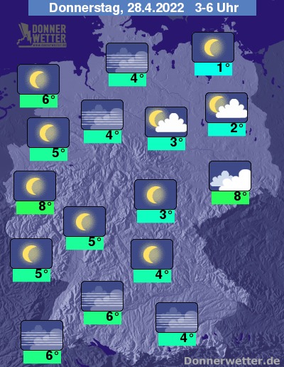 In der folgenden Nacht zeigt sich der Himmel über Deutschland verbreitet sternenklar. Im Osten und speziell über Sachsen können sich auch einige und teils dichte Wolken halten, dazu bleibt es trocken. Die Temperatur sinkt auf 8 Grad in Dresden und etwa 1 Grad in Neubrandenburg.