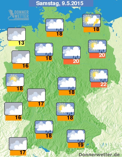 Heute zieht zumeist starke, hier und da aber auch aufgelockerte Bewölkung durch, dabei bilden sich bevorzugt in der Osthälfte des Landes sowie im Norden, gebietsweise aber auch im übrigen Bundesgebiet Schauer und regional auch einzelne Gewitter. Die Temperatur steigt auf kühle 13 Grad an der Nordsee und bis 22 Grad an der Neiße.
