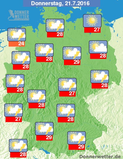Heute scheint zwischen der Ostseeküste und Berlin-Brandenburg häufig die Sonne und es bleibt hier weitgehend trocken. Im übrigen Bundesgebiet zeigen sich zum Teil Auflockerungen, jedoch ziehen oft auch dichte Wolken durch, dabei sind verbreitet Schauer und teils kräftige Gewitter möglich. Die Temperatur steigt auf 24 Grad an der Nordsee und bis 29 Grad in Magdeburg.