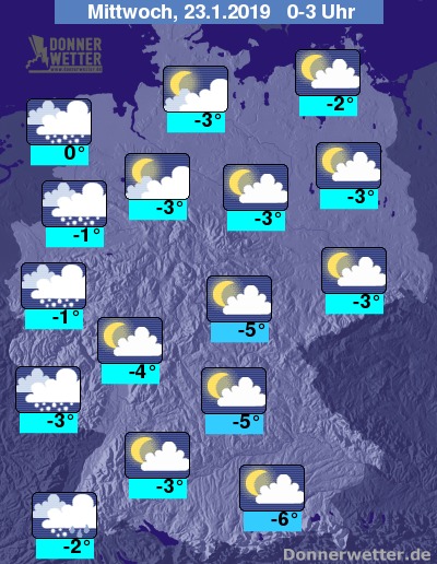Die Temperaturen sinken in den Nachstunden auf Werte um 0 Grad C an der Nordseeküste und um -6 Grad C an den Alpen.