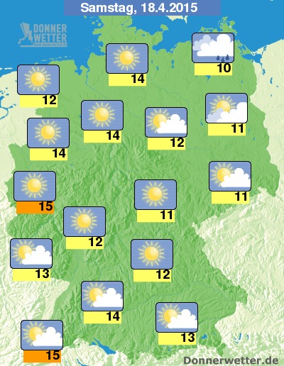 Am Samstag halten sich im Nordosten und Osten zum Teil dichte Wolken, die auch den ein oder anderen Regenschauer bringen können, im großen Rest des Landes zeigt sich aber häufig die Sonne und es ziehen, wenn überhaupt, nur lockere Wolkenfelder durch. Die Temperaturen liegen mit 10 bis 15 Grad auf typischem Aprilniveau.