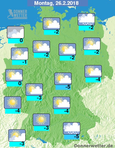 Die Temperaturen erreichen im Tagesverlauf Werte um -5 Grad C im Thüringer Bergland und um 0 Grad C in Emden.