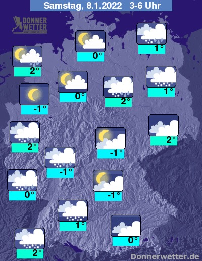 Am Samstag ist es meist stark oder dicht bewölkt, vorübergehende Auflockerungen sind jedoch möglich. Im Tagesverlauf zieht von Westen neuer Schnee auf, der im weiteren Verlauf oft in Regen übergeht. Nach Osten hin bleibt es zumeist trocken. Die Temperatur steigt auf 1 Grad in Nürnberg und bis 5 Grad in Freiburg. An den Küsten ist es häufig stürmisch.