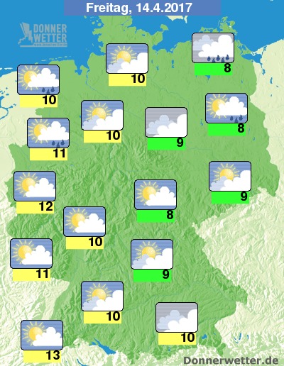 Gründonnerstag hat dann ebenfalls nasses und sonnenarmes Aprilwetter im Gepäck, die Temperaturen erreichen am Vorfeiertag Werte um 8 Grad C an den Küsten und um 13 Grad C im Breisgau.