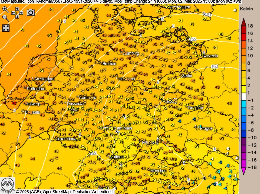 Die Wetterkarte sowie die Temperaturen / Temperaturanomalie mit 24-Stunden-Temperaturveränderung um 15:00 Uhr nach ICON:
