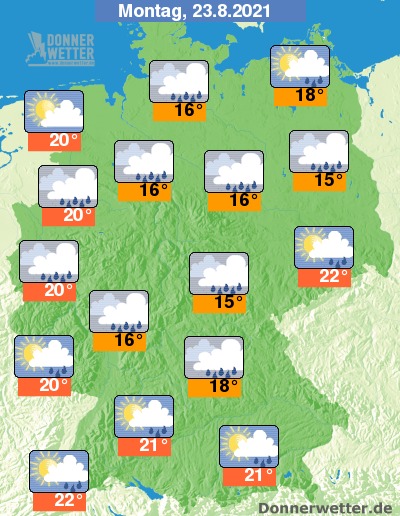 Heute ist es über der Nordhälfte Deutschlands überwiegend stark bewölkt, hier und da sind Auflockerungen möglich, jedoch bilden sich zeitweise Schauer, lokal sind auch Gewitter möglich. Im übrigen Land ist es teils dicht, teils locker bewölkt, dabei bilden sich einzelne Schauer, vereinzelt sind zudem Gewitter möglich. Die Temperatur steigt auf teils nur 15 Grad im Eichsfeld und bis 22 Grad im Breisgau.