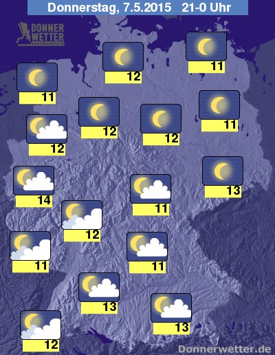 Heute Abend ist der Himmel im Norden und Osten der Republik überwiegend sternenklar, in den weiter südwestlich liegenden Landesteilen ist es zumeist locker oder aufgelockert bewölkt, jedoch ebenso trocken. Die Abendtemperatur liegt bei 14 Grad in Köln und um 11 Grad an der Donau.