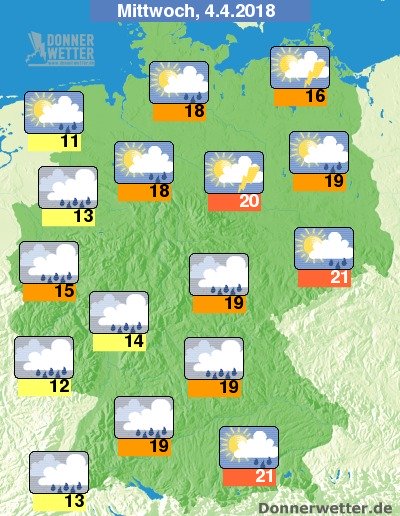 Am Mittwoch ist es mit Ausnahme der westlichsten Landesteile anfangs noch trocken und überwiegend aufgelockert bewölkt. Im Tagesverlauf ziehen die dichte Regenwolken dann ostwärts und es bilden sich zum Teil kräftige Schauer, regional sind auch Gewitter möglich. Die Temperatur steigt auf 11 bis 21 Grad.