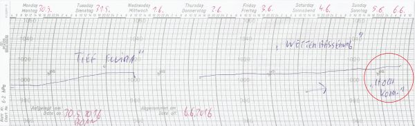 Auch der Wochenstart bringt uns noch regionale Gewitter (mehr dazu in unserem unten stehenden Deutschlandwetter), zunehmend wird nun aber ein Hochdruckgebiet wetterbestimmend. Der Schrieb zeigt den Luftdruckverlauf der vergangenen 7 Tage an unserer Wetterstation in Bonn. Gut zu erkennen ist der nun steigende Luftdruck: