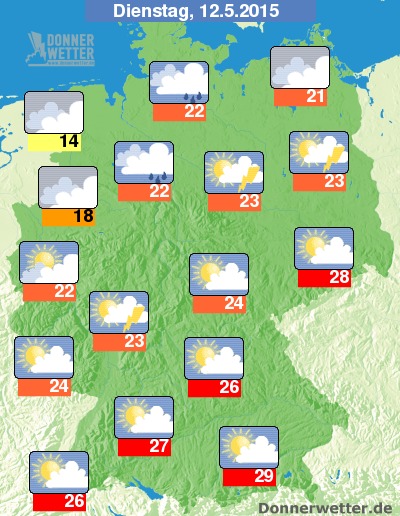 Am Dienstag ist es im Süden und Osten zunächst meist noch heiter oder auch sonnig und dabei trocken, in der Nordwesthälfte des Landes ziehen hingegen schon oft dichte Wolken durch und es können sich auch bereits am Vormittag Schauer und einzelne Gewitter entwickeln. Am Nachmittag und bis zum frühen Abend erreicht die Schauer- und Gewitterzone etwa eine Linie vom Saarland bis nach Nordbayern, dabei können sich teils kräftige Gewitter entwickeln. In der kühleren Luft im Norden und Westen fällt hier und da etwas Regen, oft bleibt es aber auch trocken. Die Temperatur steigt auf kühle 14 Grad an der Nordsee, sonst auf 18 Grad im Emsland und bis auf sehr warme 29 Grad in München.