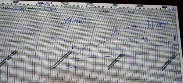 Sehr schön ist das im Luftdruckstreifen zusehen, denn in Schüben steigt der Druck Stück für Stück an und nach jedem Tief geht es langsam nach oben. Gut zu erkennen ist aucgh Tief Xavier am Donnerstag.