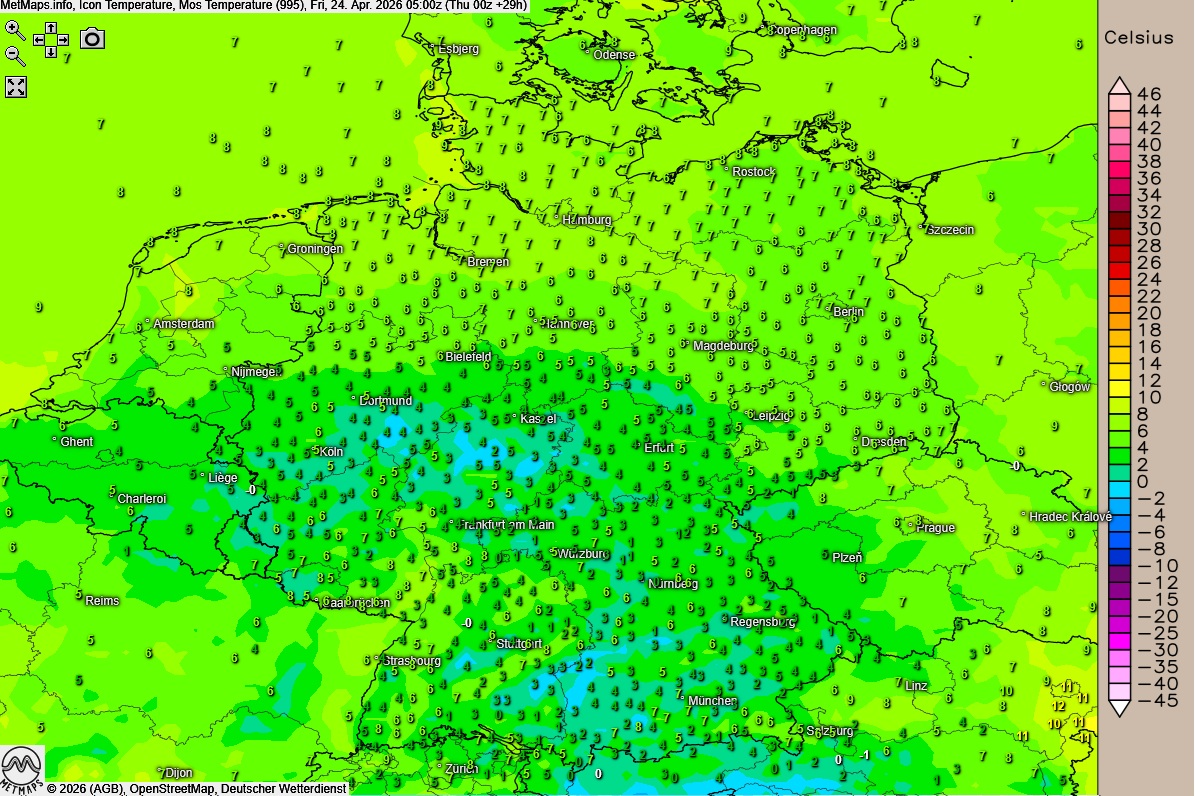 Lufttemperaturen Freitag 05:00 Uhr nach ICON
