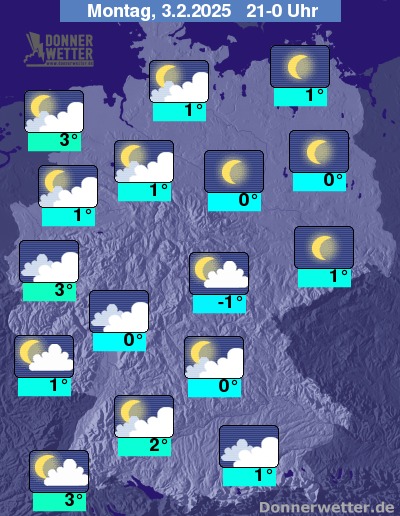 Am Montagnachmittag zeigt sich der Himmel nach Nebelauflösung über weiten Teilen des Landes heiter bis wolkig. In den Niederungen Süddeutschlands hält sich teils ganztägig zäher Nebel, auch im Nordwesten ist es wolkig; es bleibt aber meist trocken.