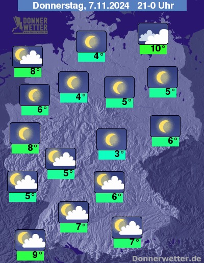 In der Nacht zum Freitag ist der Himmel über dem Westen und dem höheren Bergland verbreitet sternenklar oder nur gering bewölkt. In den übrigen Landesteilen bildet sich erneut flächendeckend Nebel oder Hochnebel, lokal ist etwas Sprühregen möglich.
