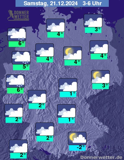 In der Nacht zum Samstag ist der Himmel verbreitet stark bewölkt oder bedeckt, gebietsweise kann es auch mal auflockern. Es bleibt zunächst meist trocken, im Nachtverlauf ziehen dann von Westen und Nordwesten Niederschläge auf, die im Bergland auch als Schnee fallen.