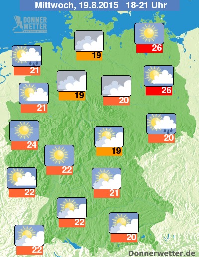 Die Temperaturen steigen von 19 Grad C in Thüringen bis zu 26 Grad C in der Hauptstadt.