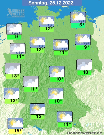 Am heutigen 1. Weihnachtsfeiertag bleibt es zum Großteil stark bis dicht bewölkt, hier und da kann es auch mal etwas auflockern. Über der Nordwesthälfte fällt dabei zeitweise Regen, während es weiter nach Südosten hin überwiegend trocken bleibt. Die Temperatur steigt auf 6 Grad in Stralsund und bis 15 Grad in Freiburg. Es weht ein teilweise stärkerer bis stürmischer Wind, häufig ist es aber auch schwachwindig.