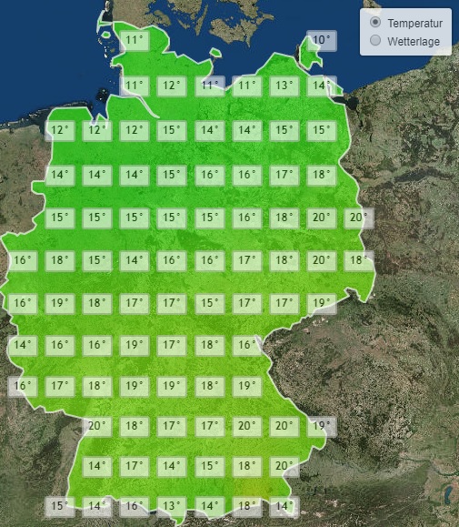 Dazu liegen die Höchstwerte am Nachmittag verbreitet bei Werten zwischen 15 und 20 Grad. Die 20 Grad Marke fällt dabei am ehesten an Donau, Rhein und Spree. Wesentlich kühler bleibt es hingegen in Küstennähe. An Nord- und Ostsee reicht es gerade einmal für Höchstwerte im zweistelligen Bereich.