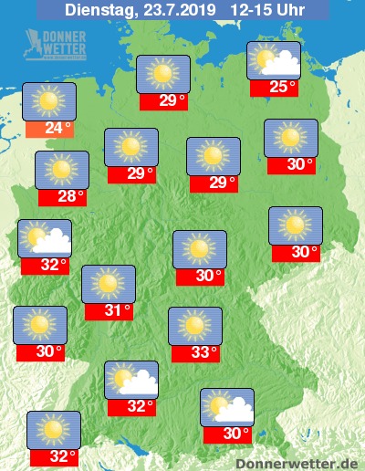 Die Temperaturen steigen im Laufe des Nachmittags noch etwas an und überschreiten in den Ballungsgebieten des Westens, sowie im Breisgau stellenweise die 35 Grad - Marke.