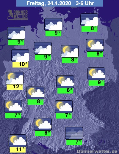 Während der Nacht ziehen über den Norden Wolkenfelder hinweg, Regen fällt daraus aber nicht. In der Südhälfte bleibt es überwiegend sternenklar oder nur leicht bewölkt. Speziell an den Bayerischen Gewässern können sich stellenweise Nebelfelder bilden.