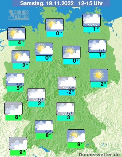 Heute Nachmittag bleibt es über der Südhälfte überwiegend stark bis dicht bewölkt, dazu fällt gebietsweise Regen, Schneeregen oder Schnee. Weiter nach Norden zeigt sich das Wetter dagegen meistens heiter, teilweise auch sonnig, dabei bleibt es meistens trocken. Lediglich im Nordosten kann es bei dichten Wolken auch gebietsweise schneien oder regnen. Die Temperatur liegt bei frostigen -2 Grad im Vogtland und bis 9 Grad im Breisgau.