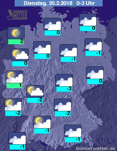 In der Nacht ist der Himmel in der West- und Südwesthälfte locker oder aufgelockert bewölkt, im äußersten Nordwesten klart es stellenweise auch auf. In den übrigen Landesteilen herrscht weiterhin dichte Bewölkung vor.
