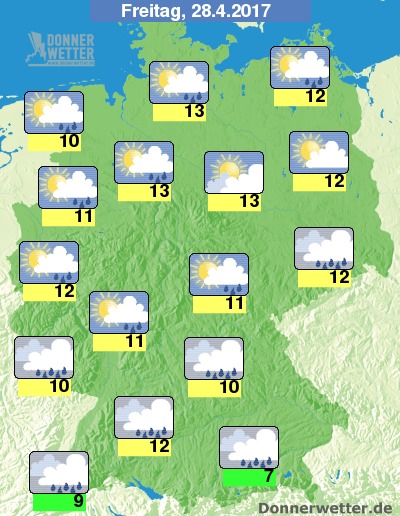 Über Süddeutschland bleibt es meistens trübe und vor allem über dem südlichen Baden-Württemberg und Bayern fällt bei 2 bis 9 Grad weiterer zum Teil kräftiger Niederschlag. Die Schneefallgrenze pendelt dabei gebietsweise zwischen 400 und 900 m. Im Nordwesten ist es wechseln wolkig mit Schauern. In einem Streifen von der Vorderpfalz, über Thüringen bis zum östlichen Mecklenburg-Vorpommern bleibt es eher trocken. Nach örtlichem Nachtfrost klettern die Temperaturen im Laufe des Nachmittags auf 10 bis 14 Grad.