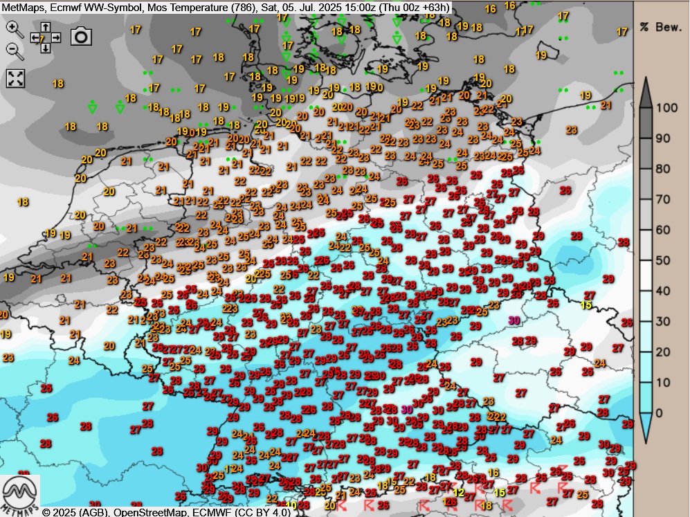 Die Temperaturen erreichen Höchstwerte um 20 Grad in Küstennähe und stellenweise 30 Grad in Teilen Süddeutschlands.