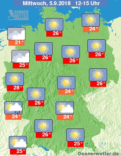 In der sehr warmen und schwülen Luft im Südwesten nehmen Schauer und Gewitter im Laufe des Nachmittags zu. Wegen der windschwachen Wetterlage bleiben die Wolken nahezu an Ort und Stelle stehen und können in kurzer Zeit große Niederschlagsmengen produzieren. Daher muss stellenweise mit Starkregen, Hagelschlag, sowie kleinräumigen Überschwemmungen gerechnet werden. Im übrigen Land wechseln sich Sonne und einige Wolken miteinander ab und es sollte meistens trocken bleiben. Die Temperaturen steigen im Großen und Ganzen noch etwas an und erreichen im Rheinland bis zu 30 Grad. Wesentlich kühler bleibt es im äußersten Nordwesten.