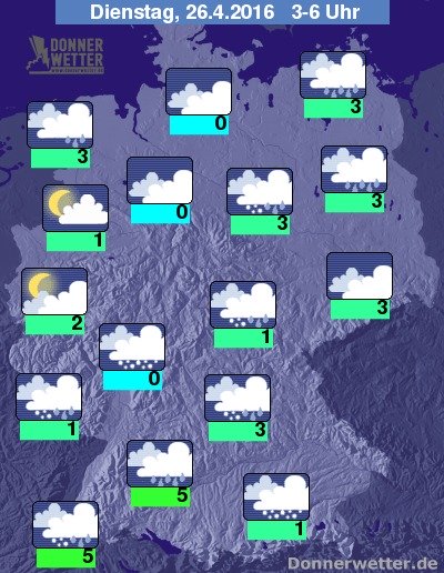 Am Dienstag sind zum Teil heitere Abschnitte möglich, häufig ziehen jedoch auch dichte Wolken durch und es bilden sich zeitweise Schauer, die bis in die Niederungen als Schnee und Graupel fallen können, seltener sind auch Gewitter dabei. Die Temperatur steigt auf 5 Grad in Mittelfranken und bis 10 Grad in Dresden.
