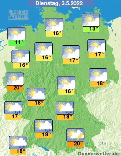 Am Dienstag zeigt sich das Wetter im Süden teilweise heiter, teils ziehen hier jedoch dichte Wolken durch, dabei bilden sich einzelne Schauer, lokal auch Gewitter. Im übrigen Land ist es meist heiter, teils aber auch stark bewölkt, dabei bleibt es weitgehend trocken. Die Temperatur steigt auf 11 Grad in Bremerhaven und bis 20 Grad in München.