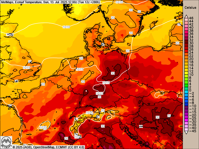 Die Karte zeigt die Temperaturen nach ECMWF für Sonntag, den 13.07.2025 (12:00 Uhr)