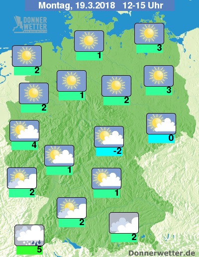 Heute Nachmittag strahlt über dem Norden verbreitet die Sonne bei wolkenlosem Himmel. Über der Südhälfte des Landes zeigt sich die Sonne zwar häufiger, jedoch können hier noch vielerorts einige und auch dichte Wolken durchziehen, dazu bleibt es trocken. Nur am Alpenrand fällt bei bedecktem Himmel gebietsweise Schnee. Die Temperatur liegt bei -2 bis 5 Grad.