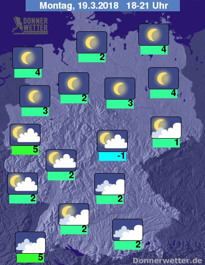 Heute Abend klingen die Niederschläge an den Alpen meist ab, trotzdem bleibt es im Alpenvorland meist bedeckt, über der übrigen Südhälfte ist es teils locker, teils stärker bewölkt, über dem Norden meist sternenklar, dazu bleibt es trocken. Die Temperatur liegt bei -1 bis 5 Grad.