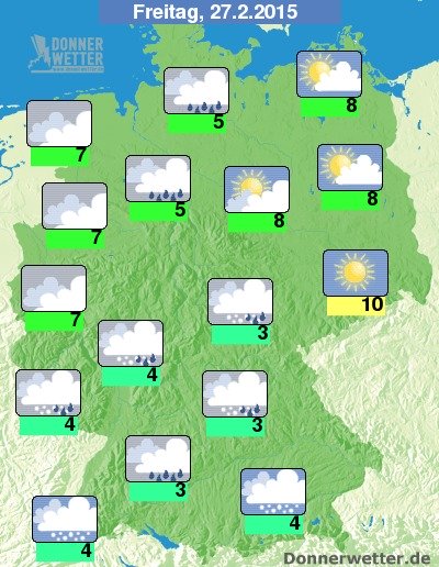Am Freitag ist es vom Nordosten über den Osten bis in den Südosten hinein häufig heiter oder auch sonnig und dazu bleibt es trocken. Sonst ziehen hingegen verbreitet dichte Wolken durch und es fällt immer wieder Regen, Schneeregen oder vor allem im Süden auch Schnee. Im Westen und Nordwesten ist es am Nachmittag bereits meist wieder trocken, die Wolkendecke bleibt jedoch weitgehend verschlossen. Die Höchstwerte liegen bei 3 Grad an der Schwäbischen Alb und bis 10 Grad in Dresden.