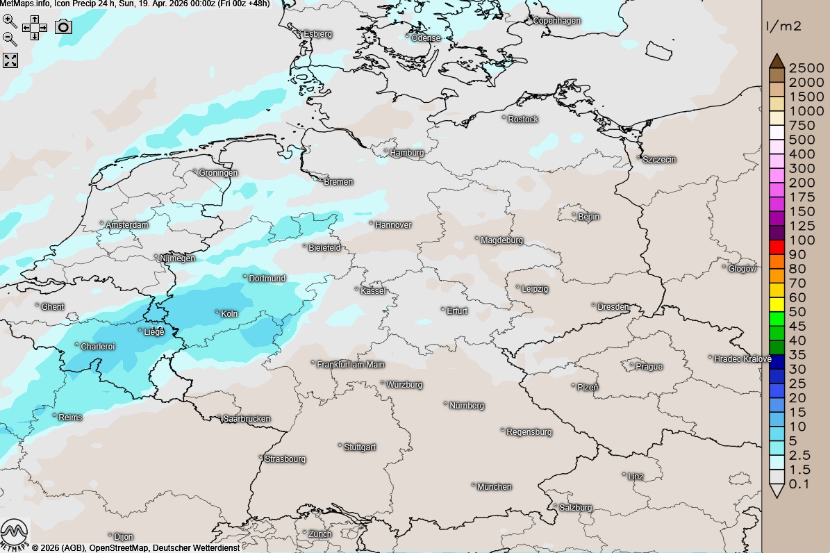 Die Wetterkarte für 06:00 Uhr, die Temperaturkarte für 15:00 Uhr sowie die 24-Stunden-Regenmengen für Samstag nach ICON:
