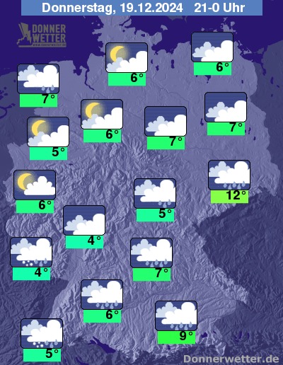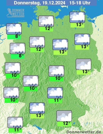Am Donnerstagnachmittag zeigt sich der Himmel über weiten Landesteilen stark bewölkt oder es ist bedeckt, dabei fällt verbreitet schauerartiger Regen, auch einzelne Gewitter sind möglich. Von Nordwesten sinkt die Schneefallgrenze auf 500 m.