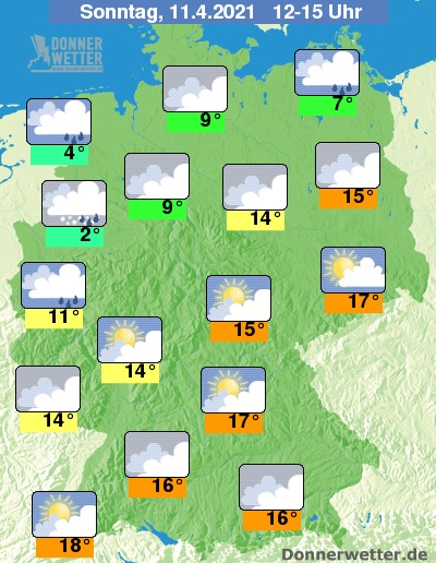Heute Nachmittag ist es im Süden und Osten noch aufgelockert, teils auch schon stark bewölkt, dabei bleibt es noch trocken. Im übrigen Bundesgebiet ziehen dagegen bereits dichte Wolken durch und es fällt vielerorts Regen, im Norden und Westen fällt örtlich auch Schneeregen oder Schnee. Die Temperatur steigt auf nasskalte 2 Grad im Münsterland und bis 18 Grad im Breisgau.