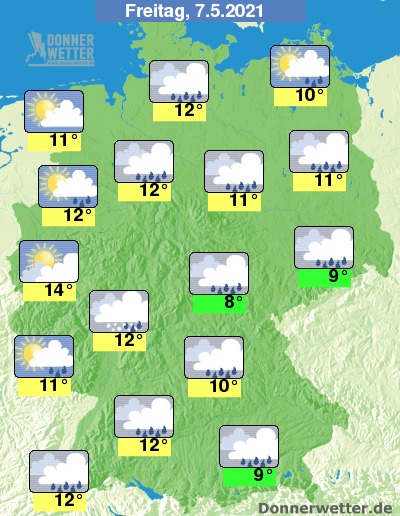 In der Nacht zum Freitag ziehen verbreitet dichte Wolken durch und es fällt immer wieder Regen, zum Teil ist sogar Schneeregen oder Schnee bis in die Niederungen möglich. Die Temperatur sinkt auf 9 Grad in Stuttgart und bis 3 Grad im Norddeutschen Tiefland.