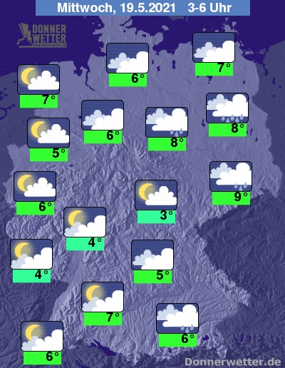 In der folgenden Nacht zeigt sich der Himmel teils stark, teils wechselnd bis aufgelockert bewölkt, es können sich hier und da einzelne Schauer bilden. Zum Großteil bleibt es aber trocken bei Tiefstwerten von 9 Grad an der Neiße und bis 3 Grad im Eichsfeld.