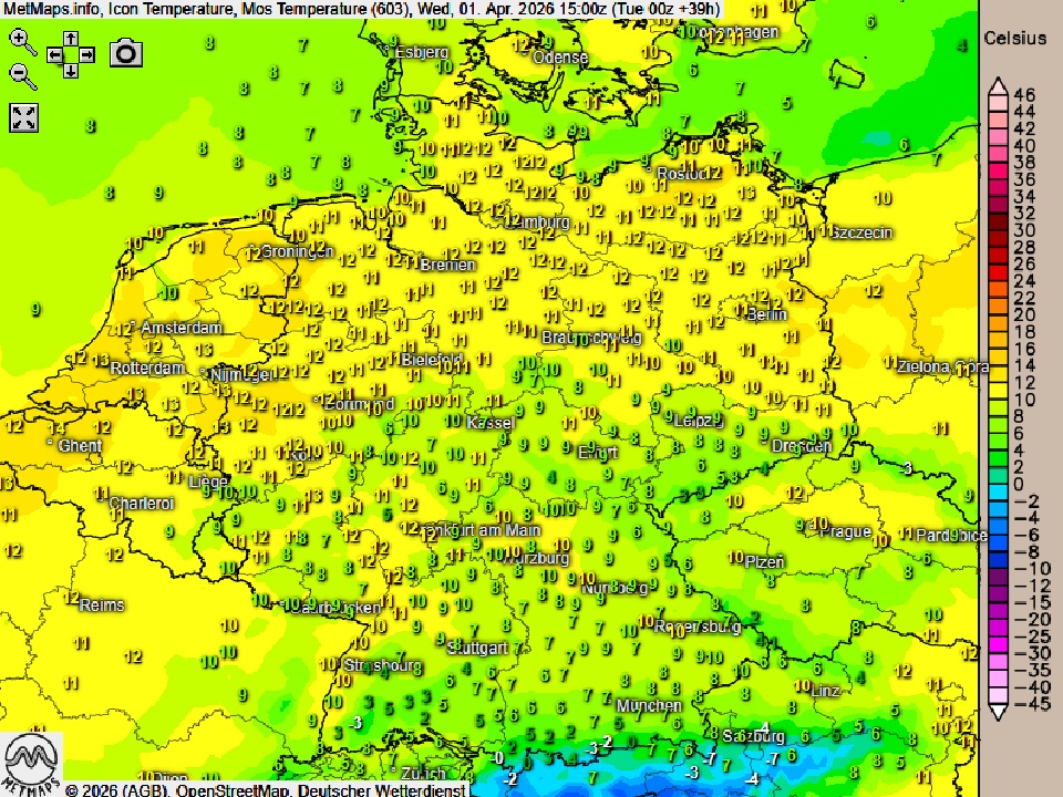 Die Temperaturen erreichen Höchstwerte um 3 Grad an den Alpen und 14 Grad im Rheinland.