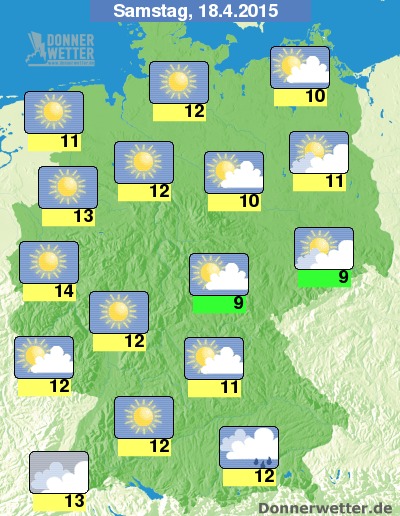 Am Samstag halten sich im äußeren Süden noch oft dichte Wolken, dazu fällt an den Alpen noch gebietsweise etwas Regen, sonst bleibt es weitgehend trocken. Im übrigen Süddeutschland und im Osten des Landes zieht oft aufgelockerte Bewölkung durch. In den übrigen Landesteilen ist es hingegen meist sonnig. Es bleibt trocken bei 9 Grad im Grabfeld und 14 Grad im Rheinland.