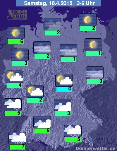 In der folgenden Nacht fällt in Alpennähe noch zeitweise etwas Regen, sonst bleibt es im süddeutschen Raum verbreitet stark bewölkt aber weitgehend trocken. Noch weiter nach Norden ist der Himmel hingegen überwiegend sternenklar und nur gebietsweise ziehen ein paar Wolken durch. Die Temperatur sinkt auf 7 Grad in Freiburg und 0 Grad im Vogtland. Stellenweise bildet sich Nebel oder Dunst.