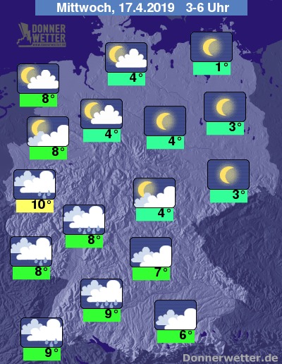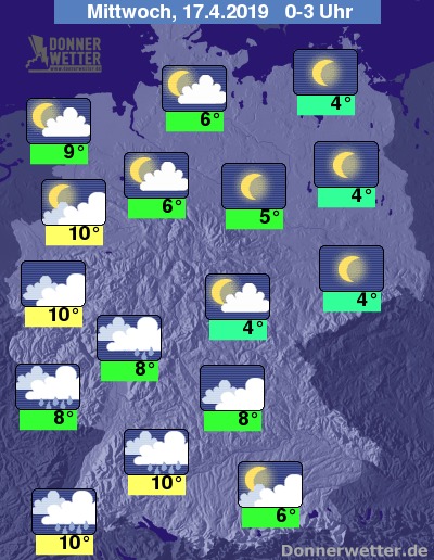 In den Nachtstunden zeigt sich der Himmel im Südwesten Deutschlands bedeckt, dabei fällt immer wieder Regen. Entlang der Oder funkeln die Sterne von einem meist wolkenlosen Himmel, in den übrigen Landesteilen ist es teils locker, teils aufgelockert bewölkt und es bleibt trocken.