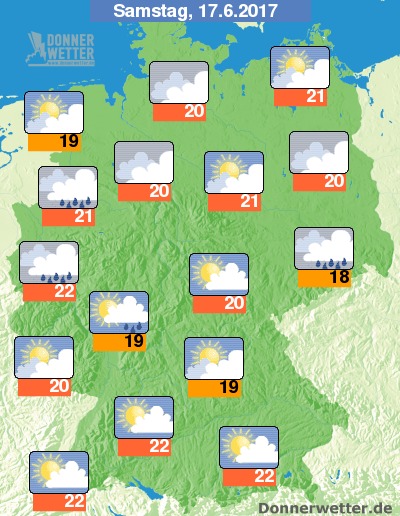 Am Samstag ziehen besonders über Sachsen und den Westen Deutschlands oft dichte Wolken hinweg, die hier gebietsweise Schauer bringen. Im übrigen Bundesgebiet ist es teils heiter, hier und da aber auch stark bewölkt, dazu jedoch weitgehend trocken. Die Temperatur steigt auf 18 Grad in Chemnitz und bis 22 Grad am Oberrheingraben.